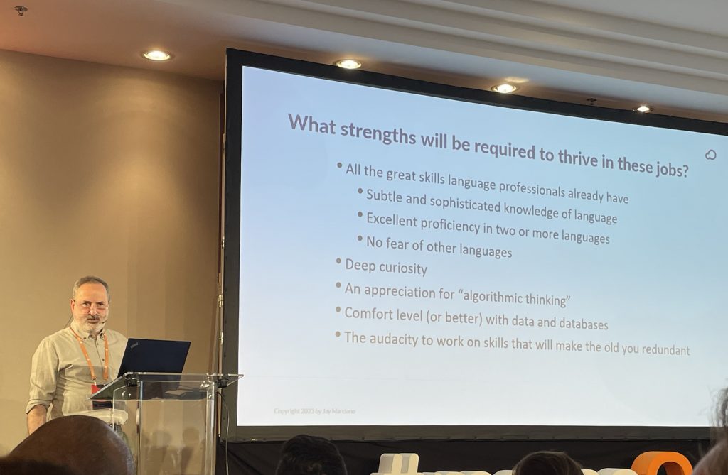 MT-Profi @Jay Marciano on Lengoo.com sieht die Zukunft von klassisch arbeitenden Übersetzer:innen angesichts der rasanten Entwicklung ohnehin düster und empfiehlt, sich eher in Richtung „Pre- oder Post-Editor“„Data Curator“, „Prompt Engineer“ und dergleichen „weiterzuentwickeln“. Allerdings stellte er in seinem Vortrag „Generative AI and the creation of cross-lingual content: ChatGPT, Large Language Models, and the future of the localization industry“ die Übersetzung an sich als rein mathematisches Problem dar.